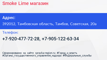 Smoke Lime, магазин по адресу 392012, Тамбовская область, Тамбов, Советская, 20а в дальнейшем Организация, размещена в следующих категориях: