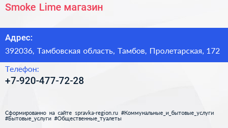 Smoke Lime, магазин по адресу 392036, Тамбовская область, Тамбов, Пролетарская, 172 в дальнейшем Организация, размещена в следующих категориях: