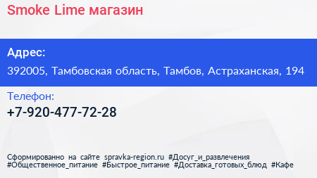 Smoke Lime, магазин по адресу 392005, Тамбовская область, Тамбов, Астраханская, 194 в дальнейшем Организация, размещена в следующих категориях: