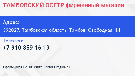 ТАМБОВСКИЙ ОСЕТР, фирменный магазин по адресу 392027, Тамбовская область, Тамбов, Свободная, 14 в дальнейшем Организация, размещена в следующих категориях: