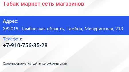 Табак маркет, сеть магазинов по адресу 392019, Тамбовская область, Тамбов, Мичуринская, 213 в дальнейшем Организация, размещена в следующих категориях: