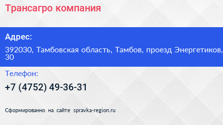 Трансагро, компания по адресу 392030, Тамбовская область, Тамбов, проезд Энергетиков, 30 в дальнейшем Организация, размещена в следующих категориях: