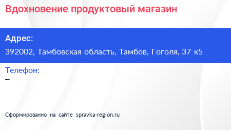 Вдохновение, продуктовый магазин по адресу 392002, Тамбовская область, Тамбов, Гоголя, 37 к5 в дальнейшем Организация, размещена в следующих категориях: