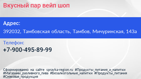 Вкусный пар, вейп-шоп по адресу 392032, Тамбовская область, Тамбов, Мичуринская, 143а в дальнейшем Организация, размещена в следующих категориях:
