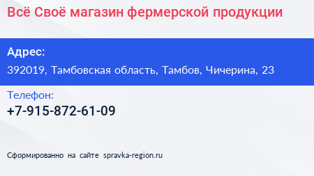 Всё Своё, магазин фермерской продукции по адресу 392019, Тамбовская область, Тамбов, Чичерина, 23 в дальнейшем Организация, размещена в следующих категориях: