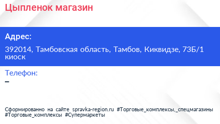 Цыпленок, магазин по адресу 392014, Тамбовская область, Тамбов, Киквидзе, 73Б/1 киоск в дальнейшем Организация, размещена в следующих категориях: