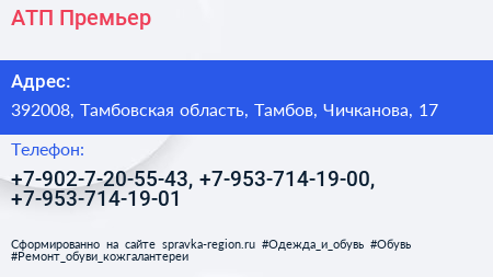 АТП Премьер по адресу 392008, Тамбовская область, Тамбов, Чичканова, 17 в дальнейшем Организация, размещена в следующих категориях: