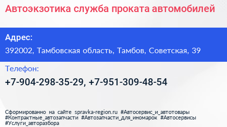 Автоэкзотика, служба проката автомобилей по адресу 392002, Тамбовская область, Тамбов, Советская, 39 в дальнейшем Организация, размещена в следующих категориях: