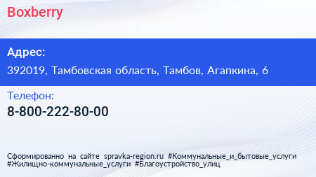 Boxberry по адресу 392019, Тамбовская область, Тамбов, Агапкина, 6 в дальнейшем Организация, размещена в следующих категориях: