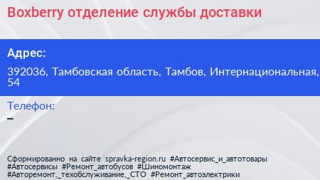 Boxberry, отделение службы доставки по адресу 392036, Тамбовская область, Тамбов, Интернациональная, 54 в дальнейшем Организация, размещена в следующих категориях: