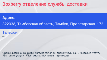 Boxberry, отделение службы доставки по адресу 392036, Тамбовская область, Тамбов, Пролетарская, 172 в дальнейшем Организация, размещена в следующих категориях:
