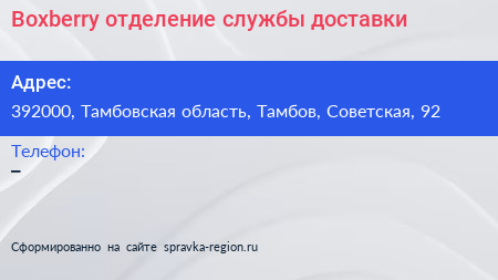 Boxberry, отделение службы доставки по адресу 392000, Тамбовская область, Тамбов, Советская, 92 в дальнейшем Организация, размещена в следующих категориях: