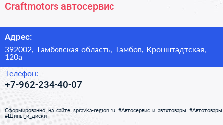 Craftmotors, автосервис по адресу 392002, Тамбовская область, Тамбов, Кронштадтская, 120а в дальнейшем Организация, размещена в следующих категориях: