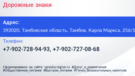 Дорожные знаки по адресу 392020, Тамбовская область, Тамбов, Карла Маркса, 256/1 в дальнейшем Организация, размещена в следующих категориях: