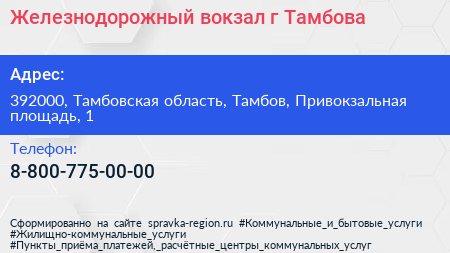 Железнодорожный вокзал г. Тамбова по адресу 392000, Тамбовская область, Тамбов, Привокзальная площадь, 1 в дальнейшем Организация, размещена в следующих категориях: