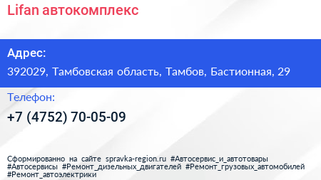 Lifan, автокомплекс по адресу 392029, Тамбовская область, Тамбов, Бастионная, 29 в дальнейшем Организация, размещена в следующих категориях: