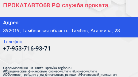 ПРОКАТАВТО68.РФ, служба проката по адресу 392019, Тамбовская область, Тамбов, Агапкина, 23 в дальнейшем Организация, размещена в следующих категориях: