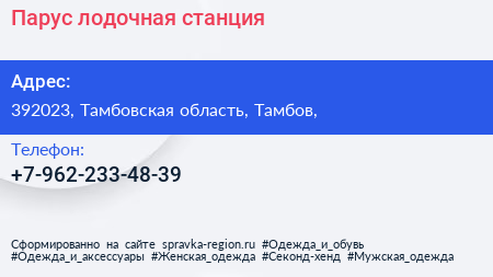 Парус, лодочная станция по адресу 392023, Тамбовская область, Тамбов, в дальнейшем Организация, размещена в следующих категориях: