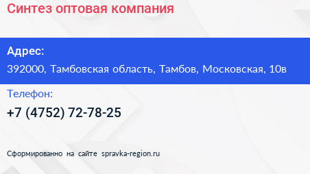 Синтез, оптовая компания по адресу 392000, Тамбовская область, Тамбов, Московская, 10в в дальнейшем Организация, размещена в следующих категориях: