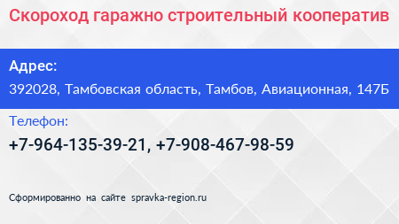 Скороход, гаражно-строительный кооператив по адресу 392028, Тамбовская область, Тамбов, Авиационная, 147Б в дальнейшем Организация, размещена в следующих категориях: