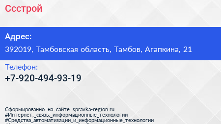 Ссстрой по адресу 392019, Тамбовская область, Тамбов, Агапкина, 21 в дальнейшем Организация, размещена в следующих категориях: