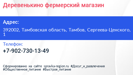 Деревенькино, фермерский магазин по адресу 392002, Тамбовская область, Тамбов, Сергеева-Ценского, 1 в дальнейшем Организация, размещена в следующих категориях: