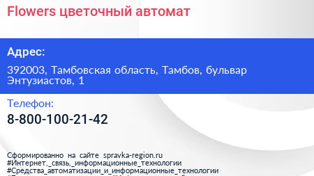 Flowers, цветочный автомат по адресу 392003, Тамбовская область, Тамбов, бульвар Энтузиастов, 1 в дальнейшем Организация, размещена в следующих категориях: