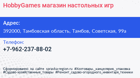 HobbyGames, магазин настольных игр по адресу 392000, Тамбовская область, Тамбов, Советская, 99а в дальнейшем Организация, размещена в следующих категориях: