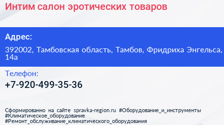 Интим, салон эротических товаров по адресу 392002, Тамбовская область, Тамбов, Фридриха Энгельса, 14а в дальнейшем Организация, размещена в следующих категориях: