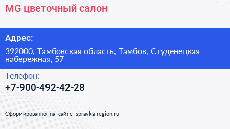 MG, цветочный салон по адресу 392000, Тамбовская область, Тамбов, Студенецкая набережная, 57 в дальнейшем Организация, размещена в следующих категориях: