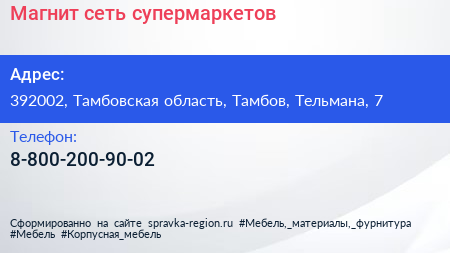 Магнит, сеть супермаркетов по адресу 392002, Тамбовская область, Тамбов, Тельмана, 7 в дальнейшем Организация, размещена в следующих категориях: