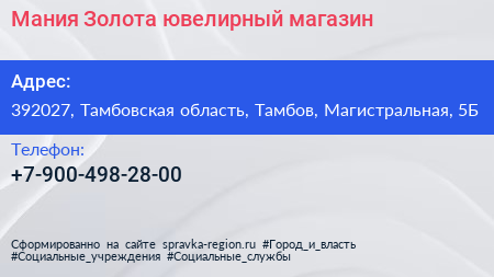 Мания Золота, ювелирный магазин по адресу 392027, Тамбовская область, Тамбов, Магистральная, 5Б в дальнейшем Организация, размещена в следующих категориях: