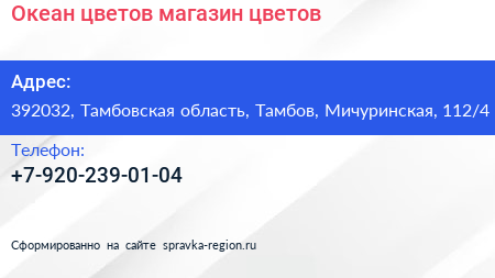 Океан цветов, магазин цветов по адресу 392032, Тамбовская область, Тамбов, Мичуринская, 112/4 в дальнейшем Организация, размещена в следующих категориях: