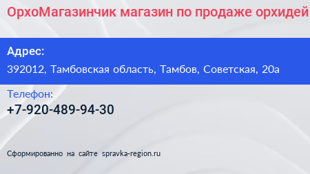 ОрхоМагазинчик, магазин по продаже орхидей по адресу 392012, Тамбовская область, Тамбов, Советская, 20а в дальнейшем Организация, размещена в следующих категориях: