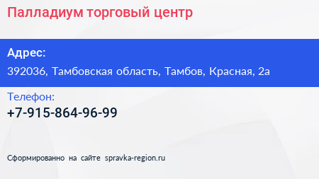 Палладиум, торговый центр по адресу 392036, Тамбовская область, Тамбов, Красная, 2а в дальнейшем Организация, размещена в следующих категориях:
