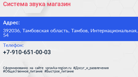 Система звука, магазин по адресу 392036, Тамбовская область, Тамбов, Интернациональная, 54 в дальнейшем Организация, размещена в следующих категориях:
