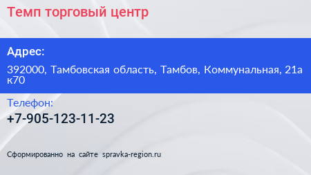 Темп, торговый центр по адресу 392000, Тамбовская область, Тамбов, Коммунальная, 21а к70 в дальнейшем Организация, размещена в следующих категориях: