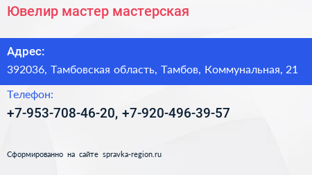 Ювелир-мастер, мастерская по адресу 392036, Тамбовская область, Тамбов, Коммунальная, 21 в дальнейшем Организация, размещена в следующих категориях:
