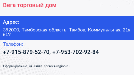 Вега, торговый дом по адресу 392000, Тамбовская область, Тамбов, Коммунальная, 21а к19 в дальнейшем Организация, размещена в следующих категориях: