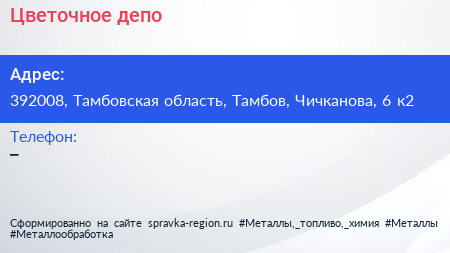 Цветочное депо по адресу 392008, Тамбовская область, Тамбов, Чичканова, 6 к2 в дальнейшем Организация, размещена в следующих категориях: