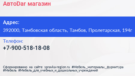 АвтоDar, магазин по адресу 392000, Тамбовская область, Тамбов, Пролетарская, 194г в дальнейшем Организация, размещена в следующих категориях: