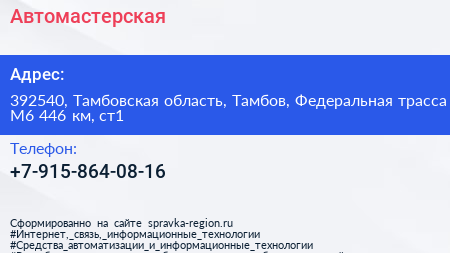 Автомастерская по адресу 392540, Тамбовская область, Тамбов, Федеральная трасса М6 446 км, ст1 в дальнейшем Организация, размещена в следующих категориях: