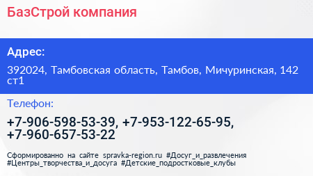 БазСтрой, компания по адресу 392024, Тамбовская область, Тамбов, Мичуринская, 142 ст1 в дальнейшем Организация, размещена в следующих категориях:
