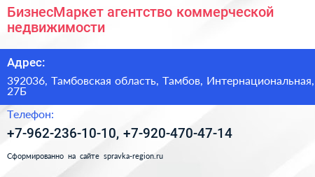 БизнесМаркет, агентство коммерческой недвижимости по адресу 392036, Тамбовская область, Тамбов, Интернациональная, 27Б в дальнейшем Организация, размещена в следующих категориях: