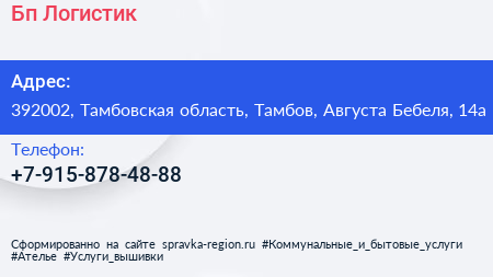 Бп Логистик по адресу 392002, Тамбовская область, Тамбов, Августа Бебеля, 14а в дальнейшем Организация, размещена в следующих категориях: