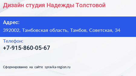 Дизайн-студия Надежды Толстовой по адресу 392002, Тамбовская область, Тамбов, Советская, 34 в дальнейшем Организация, размещена в следующих категориях: