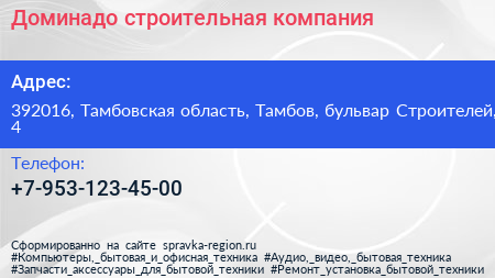 Доминадо, строительная компания по адресу 392016, Тамбовская область, Тамбов, бульвар Строителей, 4 в дальнейшем Организация, размещена в следующих категориях: