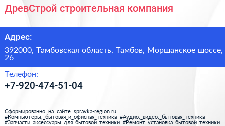ДревСтрой, строительная компания по адресу 392000, Тамбовская область, Тамбов, Моршанское шоссе, 26 в дальнейшем Организация, размещена в следующих категориях: