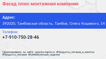Фасад плюс, монтажная компания по адресу 392020, Тамбовская область, Тамбов, Олега Кошевого, 14 в дальнейшем Организация, размещена в следующих категориях: