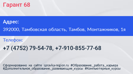 Гарант 68 по адресу 392000, Тамбовская область, Тамбов, Монтажников, 1я в дальнейшем Организация, размещена в следующих категориях: